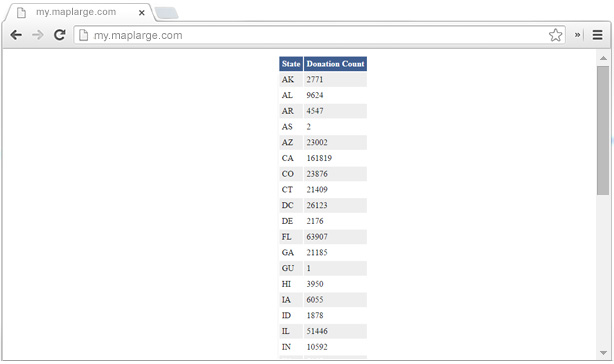 <html> <head> <script type="text/javascript" src="/JS"></script> <script type="text/javascript"> ml.onload(function () { var q = ml.query().from('Example/CampaignDonors'); // choose the columns to return q.select('State','Amount.avg'); // group the data q.groupby('State').orderby('Amount.avg.desc').take('10'); // execute the query and process the return with the callback q.run(function (data, query) { // get a reference to the element that will house our HTML table var dataDiv = document.getElementById("dataDiv"); // build the HTML table var html = '<table><tr><th>State</th><th>Donation Avg</th></tr>'; for(var i = 0; i < data.data.State.length; i++){ html += '<tr><td>' + data.data.State[i] + '</td>'; html += '<td>$' + ml.util.addCommas(data.data.Amount_Avg[i]) + '</td></tr>'; } html += '</table>'; dataDiv.innerHTML = html; }); }); </script> <style> table tr:nth-child(even) { background-color: rgb(231, 231, 231) } table tr:nth-child(odd) { background-color:#fff; } table th { background-color: rgb(86, 110, 140); color: white; padding: 5px; } table td { padding: 5px; } </style> </head> <body> <div id="dataDiv"></div> </body> </html>